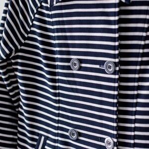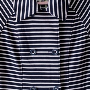 Adorable Cabi Trench coat in a blue and white striped knit (style #5151). The trim on the inside is so cute! Features a double breasted front button closure, collar/lapel, front pockets and is light weight and hits mid length. 3/4 sleeves.