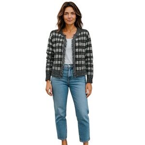 Stay cozy and stylish with this CAbi Medium Neutral Fringe Knitted Cardigan Sweater. Made from 100% cotton, this sweater is both soft and breathable, perfect for layering in any season. The neutral colors of green, gray, black, and white are woven into a plaid-like pattern, adding a touch of classic style to your wardrobe.
