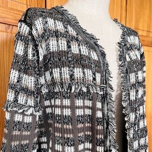CAbi Medium Neutral Fringe Open Front Short Knitted Cardigan Sweater Cotton