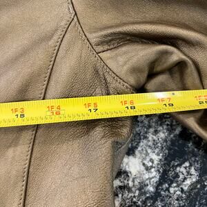 SIZE 8 (no size tag) - This CAbi Metallic Gold Leather Blazer Jacket is great for any occasion. 2 Button closure, gold metallic leather, fully lined, genuine leather. COLOR is gold metallic, NOTE - There is a small spot on front bottom... see photo, Size tag is cut out. Approximate Measurements Pit to pit: 18", Length 23", Shoulder across: 17", Sleeve length: 23"