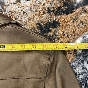 SIZE 8 (no size tag) - This CAbi Metallic Gold Leather Blazer Jacket is great for any occasion.   2 Button closure, gold metallic leather, fully lined, genuine leather. COLOR is gold metallic, NOTE - There is a small spot on front bottom... see photo, Size tag is cut out. Approximate Measurements Pit to pit: 18", Length 23",  Shoulder across: 17", Sleeve length: 23"
