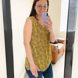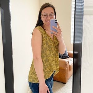 I just love this delicate and light sleeveless mustard paisley CAbi top! It is lined and has a pleated split neckline with optional keyhole clasp closure. Perfect for the office or a day out on the town! Says M but I would say best fits L.