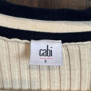 This sweater is made by Cabi. It’s a cream and navy blue ribbed, button front cardigan. Size small and in very nice pre owned condition. Smoke and pet free home.