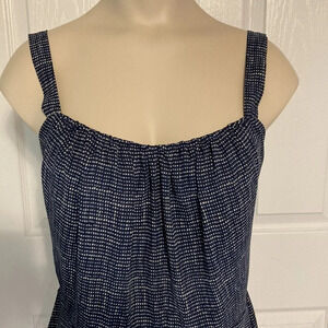 CAbi Navy & White Peplum Tank in size 8. Style #403, 100% polyester, hidden back zipper and adjustable straps. Excellent like new condition. Please see photos for approximate measurements laying flat and details. From smoke free and pet free home.