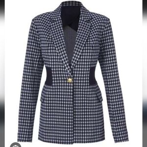 Stylish navy and white checkered blazer. Features a tailored fit and classic design. Ideal for professional or casual wear.
