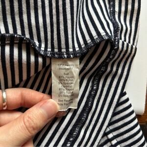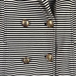 Navy blue and white striped three-quarter sleeve and double-breasted blazer suit jacket. Four gold anchor buttons on front of jacket; three gold anchor buttons on each sleeve cuff. Stretchy, comfortable material. Excellent condition!