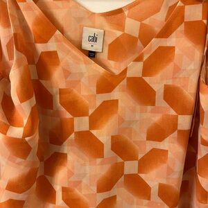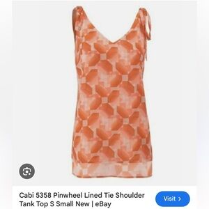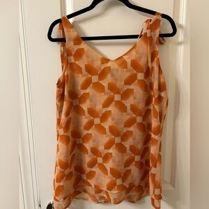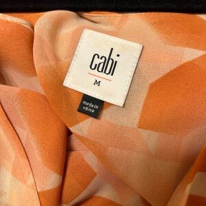 This CAbi camisole showcases a vibrant blend of orange and tan hues in an abstract pattern, perfect for adding a pop of color to your wardrobe. The sleeveless design and tie front detail offer a chic and breezy style, ideal for warm weather. Crafted from a lightweight fabric, this top ensures comfort and effortless elegance.