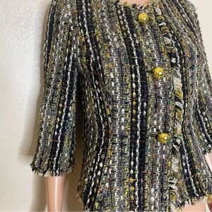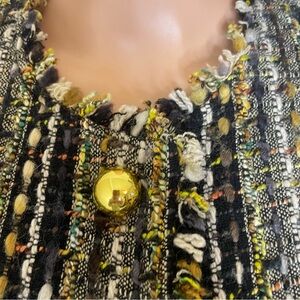 women’s tweed jacket, multicolor boucle blazer, gold button jacket, cropped 3/4 sleeve blazer, textured tweed coat, vintage-inspired jacket, elegant office wear, black and gold woven blazer, chic fall jacket, structured women’s tweed top