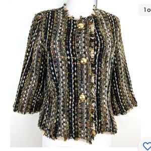 CAbi Paris tweed blouce blazer Boucle Brown Tweed Fringed Gold Buttons Women's