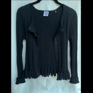 The perfect little black sweater. Great detailing and style. Ribbed fabric styling for a curvy fit buttoned. Great fabric covered snap front closure. Ruffle along bottom edge makes it more than just a plain black sweater. Soft blended fabric.