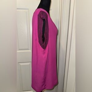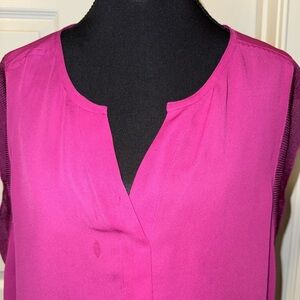 This CAbi blouse features a vibrant pink color with contrasting black trim around the v-neckline, offering a chic and stylish look. The blouse has a classic design with a loose, flowing silhouette, perfect for both casual and business casual settings. Its lightweight material ensures comfort and elegance throughout the day.