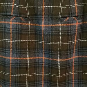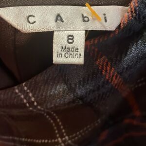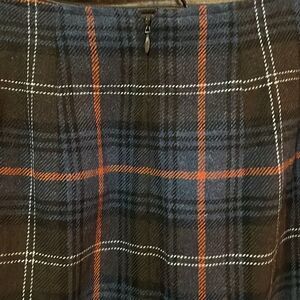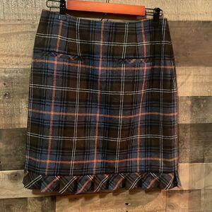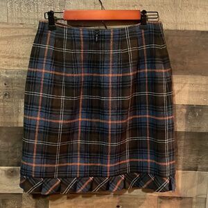 CAbi Plaid Chilly Chantilly Wool Blend Skirt, size 8. Excellent used condition. Ruffle hem. Back zip. Faux front pockets. Brown, blue, cream and orange plaid. Dry clean only. Lined.