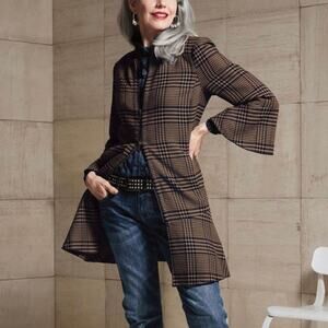 NWT Small CAbi jacket. Woven plaid houndstooth pattern in navy, tan and brown. Zip front. Pockets! Three quarter length sleeves with flounce cuffs. Loose fit.