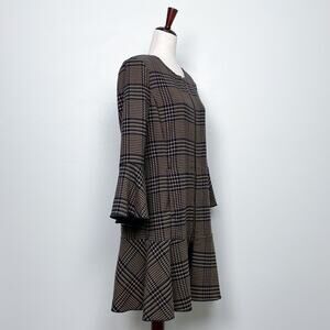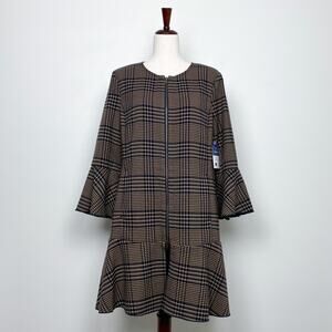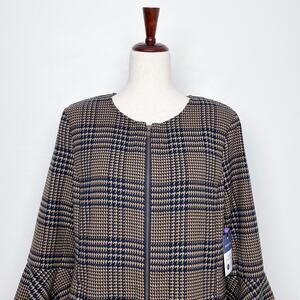 CAbi Plaid Houndstooth Zip Front Navy Brown Flounce Hem Jacket NWT