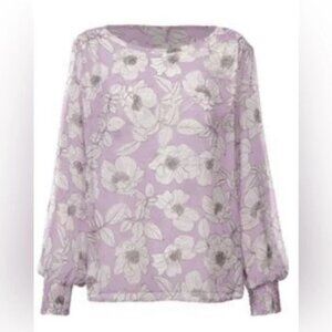 Lovely blouse from CAbi in a beautiful shade of light purple with white flowers outlined in black. Purchased at a CAbi Outlet but never worn. I cut the tags off but still have them. Tried it on quickly when I got home and thought it would work. Tried it on again AFTER removing the tags and realized it's a little too loose on me. Smocking on the shoulders and cuffs.