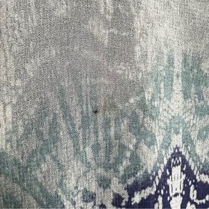 CAbi purple and white sheer blouse has a tiny hint of teal at the top of the purple border. Featuring short sleeves, split V neckline with ties and semi sheer overlay.