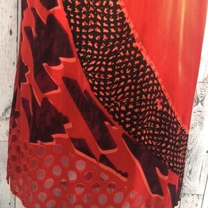 Shades of red, black, exposed zipper on back, minor snags and hem flaw see pic,colors may vary due to lighting, used condition, size M