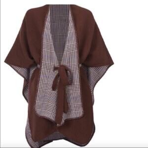Cozy reversible wrap, maroon/cream plaid reversible to solid maroon with self tie wear as a cape or poncho. Can be worn with or without removable belt. Great condition!