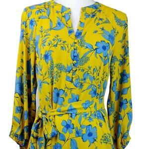 The Lemon Drop dress from CAbi is the perfect pick for effortless style with its slim-fitting, A-line design and self-tie belt at the waist. The unique color palette combines a yellow ground with a blue floral print for an eye-catching effect.