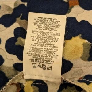 CAbi Fierce animal print/autumn floral sleeveless blouse. Curved hem, slightly ruffled split neckline. Size XS.
