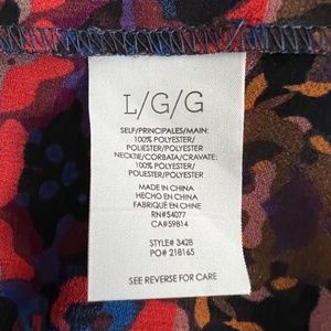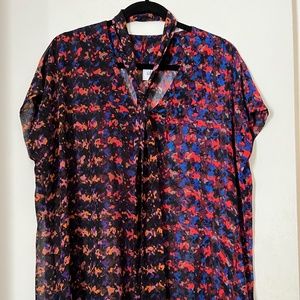 CAbi Sheer V-neck cap sleeve abstract multi-color print blouse with an optional tie/sash that can be worn around your neck or waist. Very flattering on.