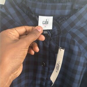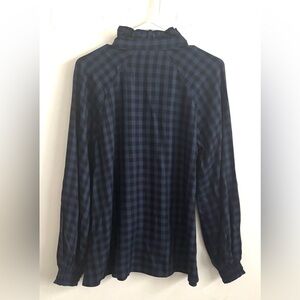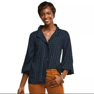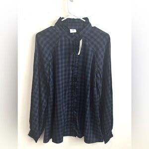 CAbi Shirt Women’s Navy Blue S Career Plaid Long Sleeve Ruffled Button up office