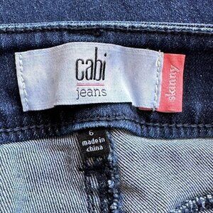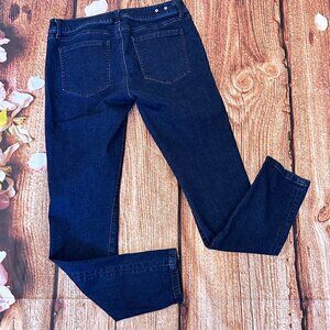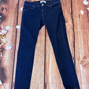 Jeans are dark wash, Button and zip front, Pockets, Skinny, Mid rise