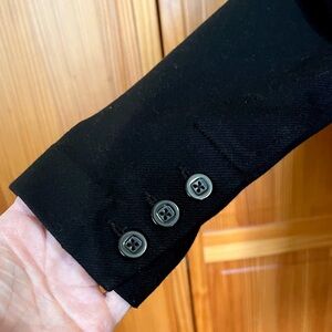 The jacket buttons up the front with striking military-style buttons, which are also featured on the wrists for added detail. The back slit still has the manufacturer’s stitch intact, suggesting it is new without tags. Measuring 18” from armpit to armpit, this jacket offers a tailored fit that flatters the figure.