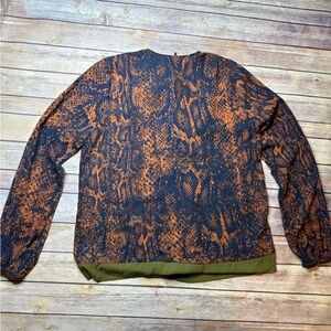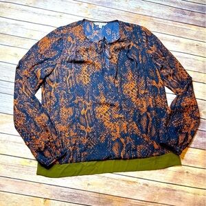 CAbi Snakeskin Blouse Blue Orange Pattern Green Border Long Sleeve Faux Wrap Front With Tie Up Snake Skin