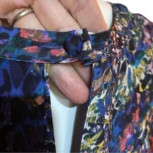 Gorgeous "stained glass" multi-color pattern with purple, black, yellow, red, white, pink, blue. Sleeveless with rounded neckline. Darted at bust and swing waistline. Keyhole front with pin tuck pleats down center. Keyhole covered-button back closure. Fully lined. Lightweight, easy care polyester; machine washable