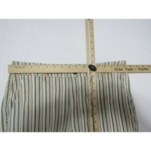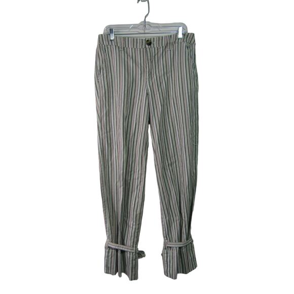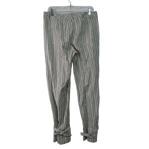 Stylish ankle pants with vertical stripes. Features a button closure. Perfect for casual wear.