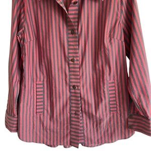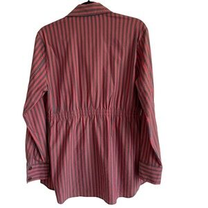 Darling striped shirt jacket from CAbi, Size Medium. Style #6083. Buttons down the front, two functional pockets, and cinching on the back along the waist. In excellent preowned condition; no flaws or signs of wear.