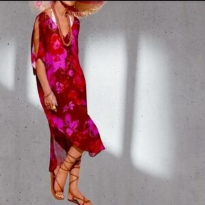 CAbi Tahitian Breezy Coverup M/L Button Front Dress Kaftan Kimono Pink Brown