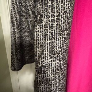 Soft knit black and white tweed. 3/4 sleeves and side pockets. 3 hook closure. Nice detailing. Wear this almost any time of the year.