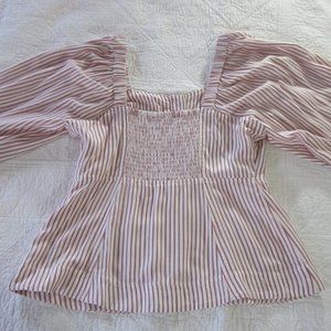 CAbi Top M Carnival Red/White Stripe Puff Sleeve Spring 2021 #5890. This top is in a gently used condition with no rips or stains.