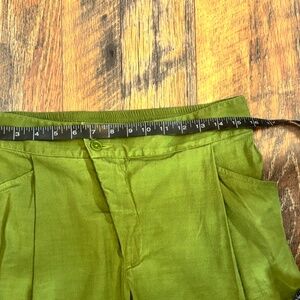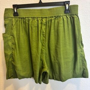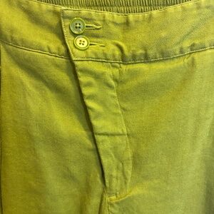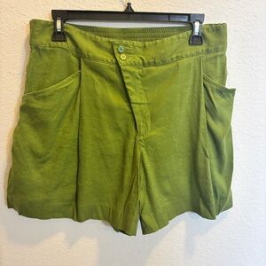 Cabi Traipse Short in Avocado Green. High rise Relaxed fit Stretch Asymmetrical zip and button front closure Elastic waistband in the back Front pleats at the waistband Pockets at the hips go under the front pleat Gently Used - Like New Condition