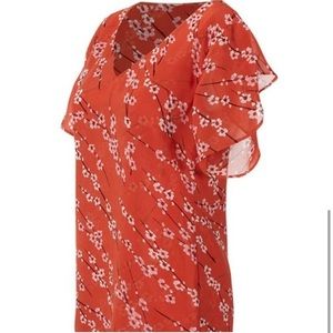 I just adore this delicate and light tulip flutter sleeve fun orange CAbi top! It is lined and features a v neck, tulip flutter sleeves, and a beautiful cherry blossom print. Perfect for warm weather, the office, or a day out on the town! Says M but will fit M/L.