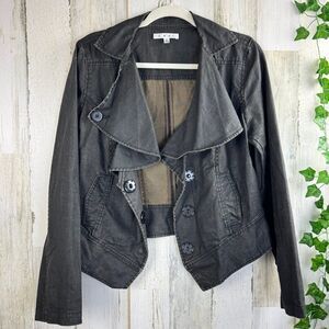 CAbi Waxed Linen Moto Jacket Womens M Black wash Ruffle Snap Front Pockets Cropped