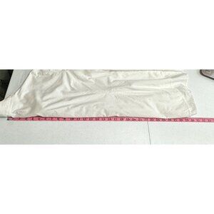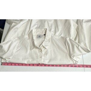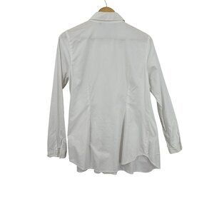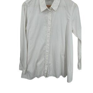 White button down shirt, A-line shape with side seam buttons ready to pair with skinny jeans or leggings. Reposhing because the original seller used the inaccurate AI description and it wasnt the shape I expected.