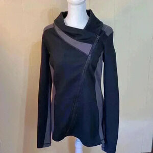 CAbi Woman’s Black & Lavender Moto Asymmetrical Style Jacket in Size Medium. Good pre owned condition. Pockets, thumb holes and a heavy duty zipper and high/low hem. Really nice jacket!