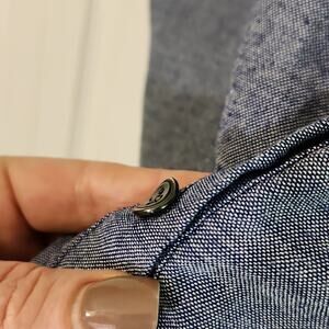 Very flowy and comfortable. The buttons are unique with a scoop in the middle of them. Open area in back. EUC
