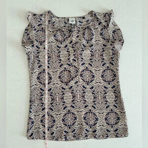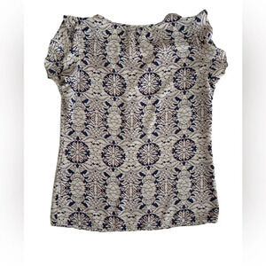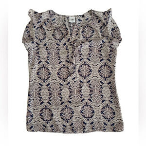 CAbi Women’s Cream Blue Damask Flutter Short Sleeve Blouse Small #3074