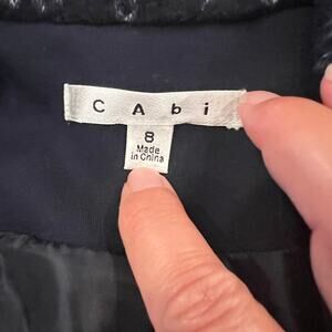 SIZE 8 - CAbi Women's Jacquard Paisley Wool Blend Midnight Navy Blazer is gorgeous! Fully lined jacket features button front and button cuffs. Color Navy, Color block collar Jacquard pattern, Front button patterned closure, 59% Polyester, 39% Wool,2% Acrylic. Contrast 67% Rayon, 28% Nylon, 5% Spandex. Lining 100% Polyester APPROXIMATE MEASUREMENTS - Chest across is about 20", Length is 26" and 27 1/2".