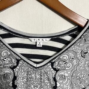 This CAbi blouse is a stylish and unique top featuring a layered design. The outer layer is a flowy, short-sleeve top with a detailed paisley pattern in black and white. The inner layer, which extends below the hem, is a black and white striped knit fabric, visible at the v-neckline, sleeves, and hemline. The contrast in patterns and materials creates a chic, mixed-media look. The top is a women's size Small and made from a blend of silk and viscose, offering a soft and comfortable fit. This piece is perfect for a business casual look or a trendy, everyday outfit.