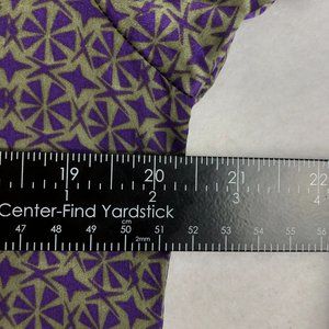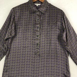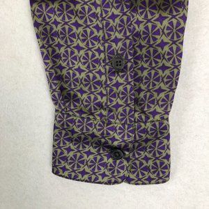 Women's silk gray and purple printed collared blouse. Long sleeves with button cuffs, collared neckline, partial button closure. Lightweight.