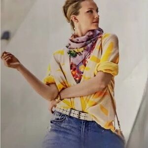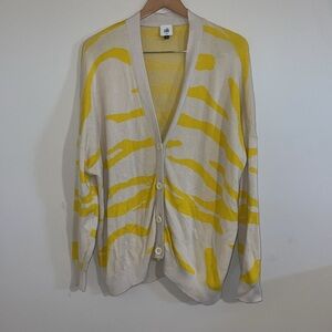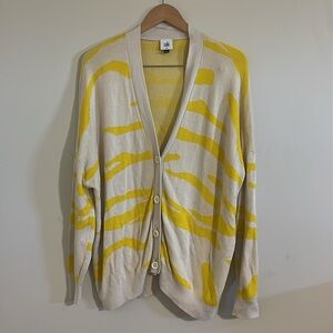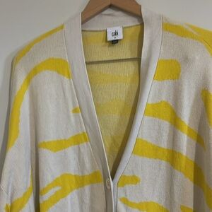 Stylish CAbi cardigan with bold yellow patterns. Soft cream base. Button-up front. Perfect for layering.