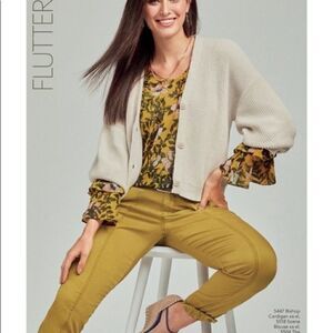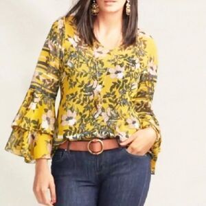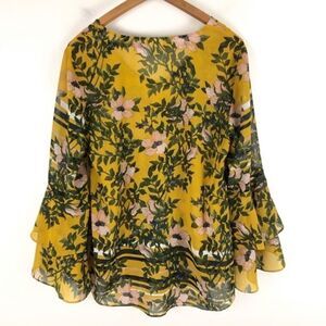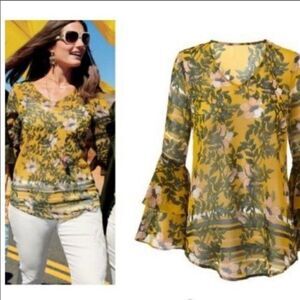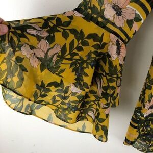 Vibrant yellow blouse with green floral pattern. Flowy design with long sleeves. Perfect for a stylish look.