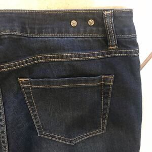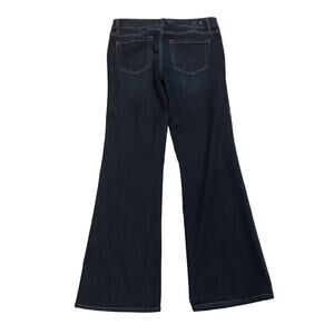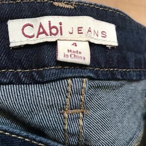 CAbi flare leg dark rinse bootcut jeans with distressing on front legs size 4