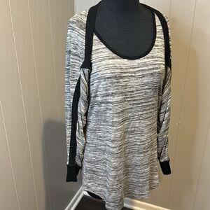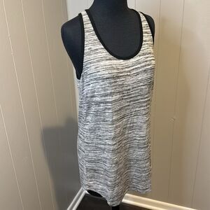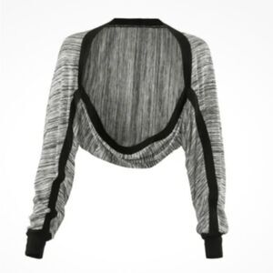 CAbi marled gray black edged horizontal knit shrug & racerback tank set. Medium. Tank armpit to armpit approximately 18 1/2 inches. Shoulder to hem approximately 29 1/2 inches. Rayon/polyester/spandex blend. Excellent condition. Nonsmoking home.