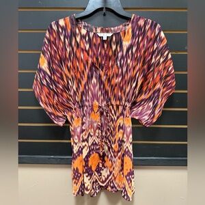 Stylish blouse with vibrant orange and purple pattern. Flattering fit with unique design. Perfect for any occasion.